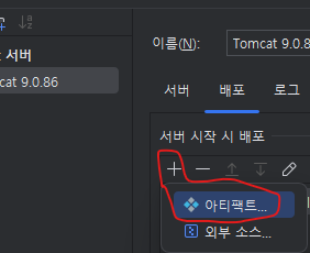 기존의 설정을 -버튼을 눌러 삭제하고, +버튼을 눌러 아티팩트를 추가한다.