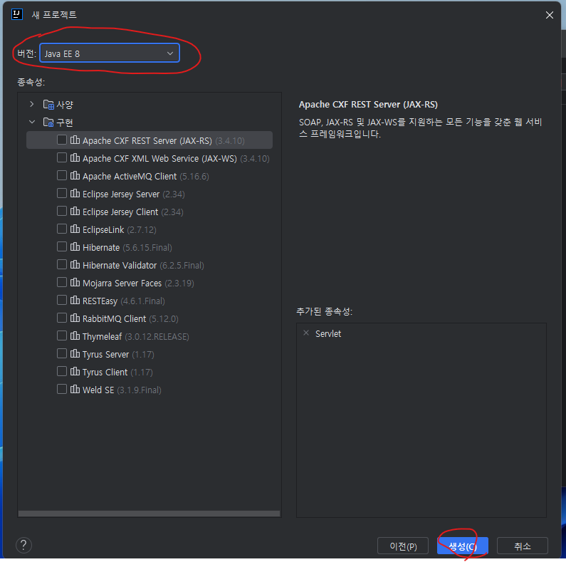버전은 꼭 Java EE 8로 선택하고 아래 생성 버튼을 클릭한다.